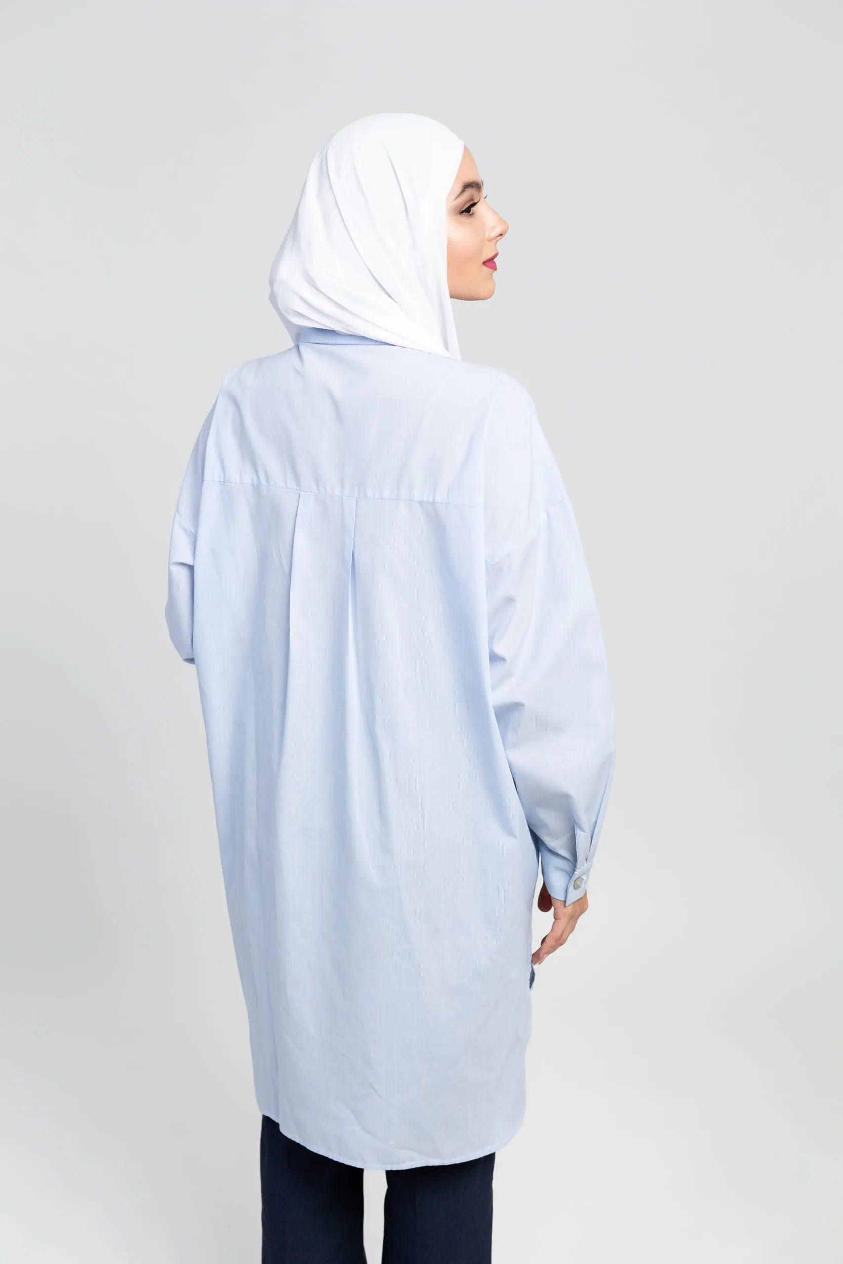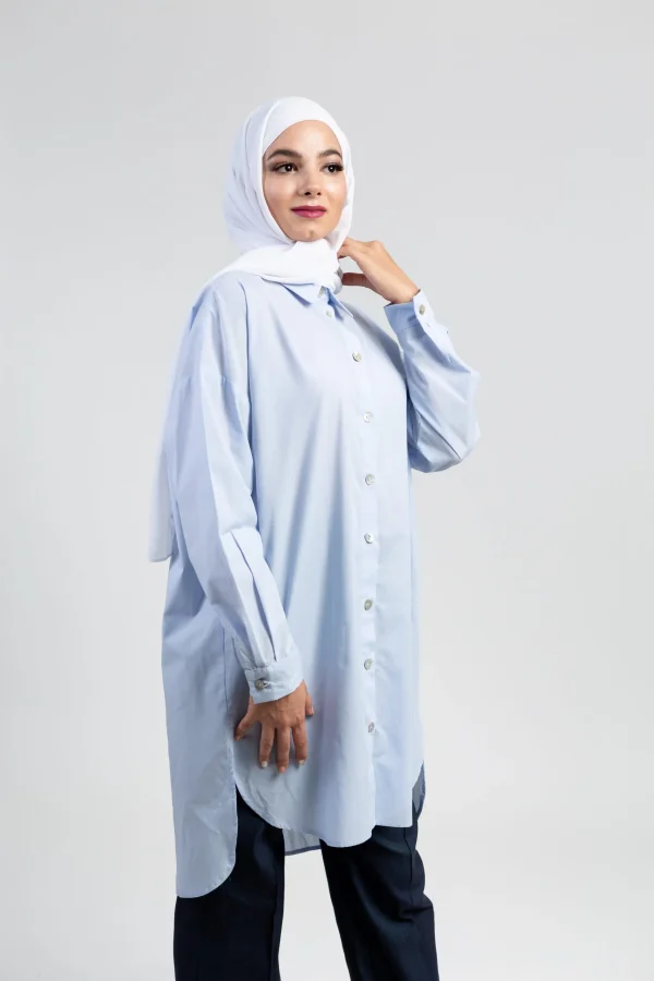 100% cotton, Our oversized shirt  is carefully crafted from high quality materials. The soft, breathable fabric keeps you feeling comfortable all day long, while its timeless blue color adds a touch of style to your outfit. The shirt is also easy to care for, making it a practical choice for everyday use.
