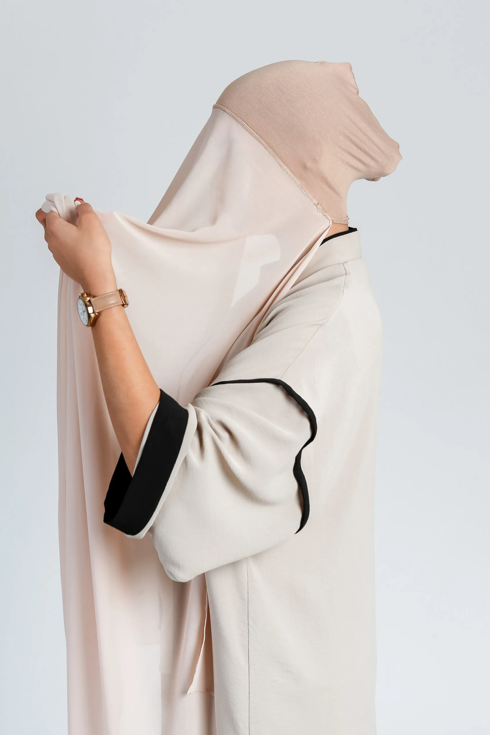 Optez pour l’excellence avec notre Foulard Avec Bonnet intégré beige – Instant Hijab et vivez l’expérience d’un hijab qui allie confort, style en un instant!