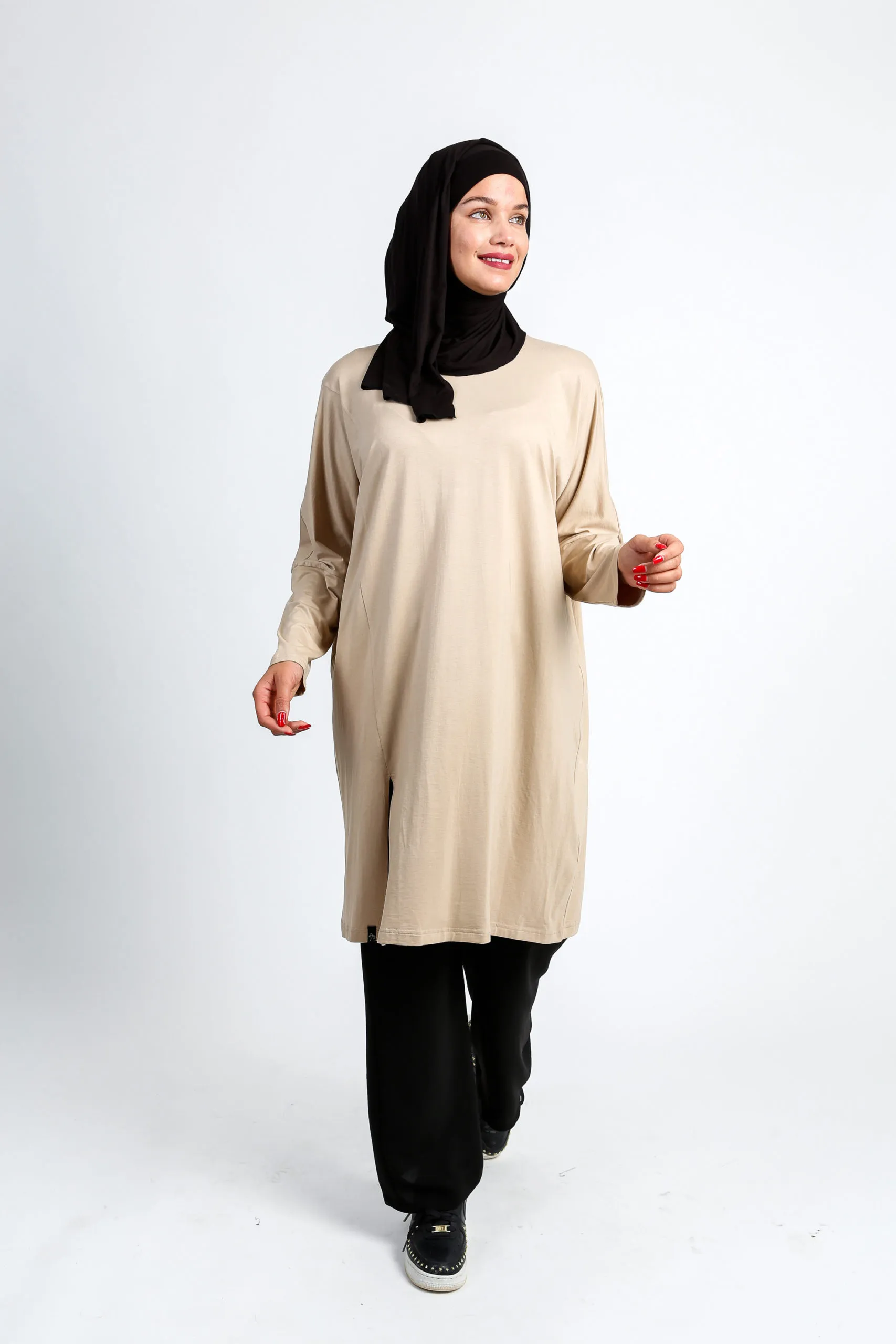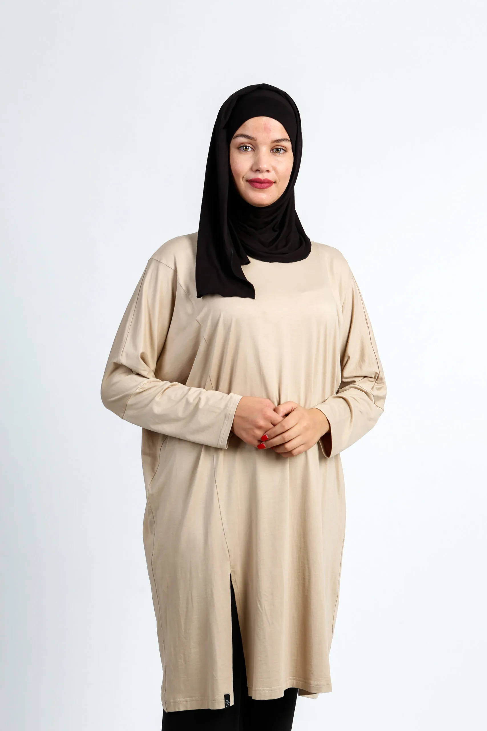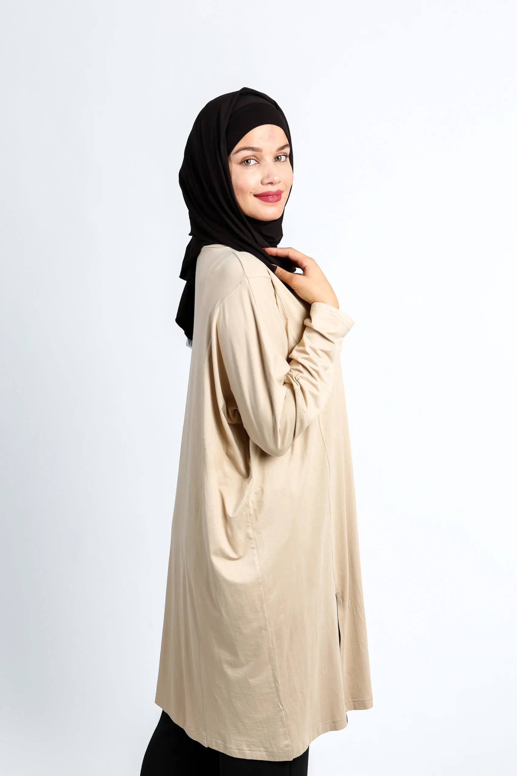 Ajoutez une touche de raffinement à votre garde-robe avec notre Long Pull Ample Beige. Conçu spécialement pour les femmes voilées, ce pull long en 100 % coton offre un mélange parfait de confort et de style avec sa coupe droite flatteuse et son col rond. La fente sur le devant ajoute une touche de modernité et d’élégance à ce pull, idéal pour un look décontracté et chic au quotidien. disponible en Rose Indien, Noir, Bleu Marine et Vert Militaire.