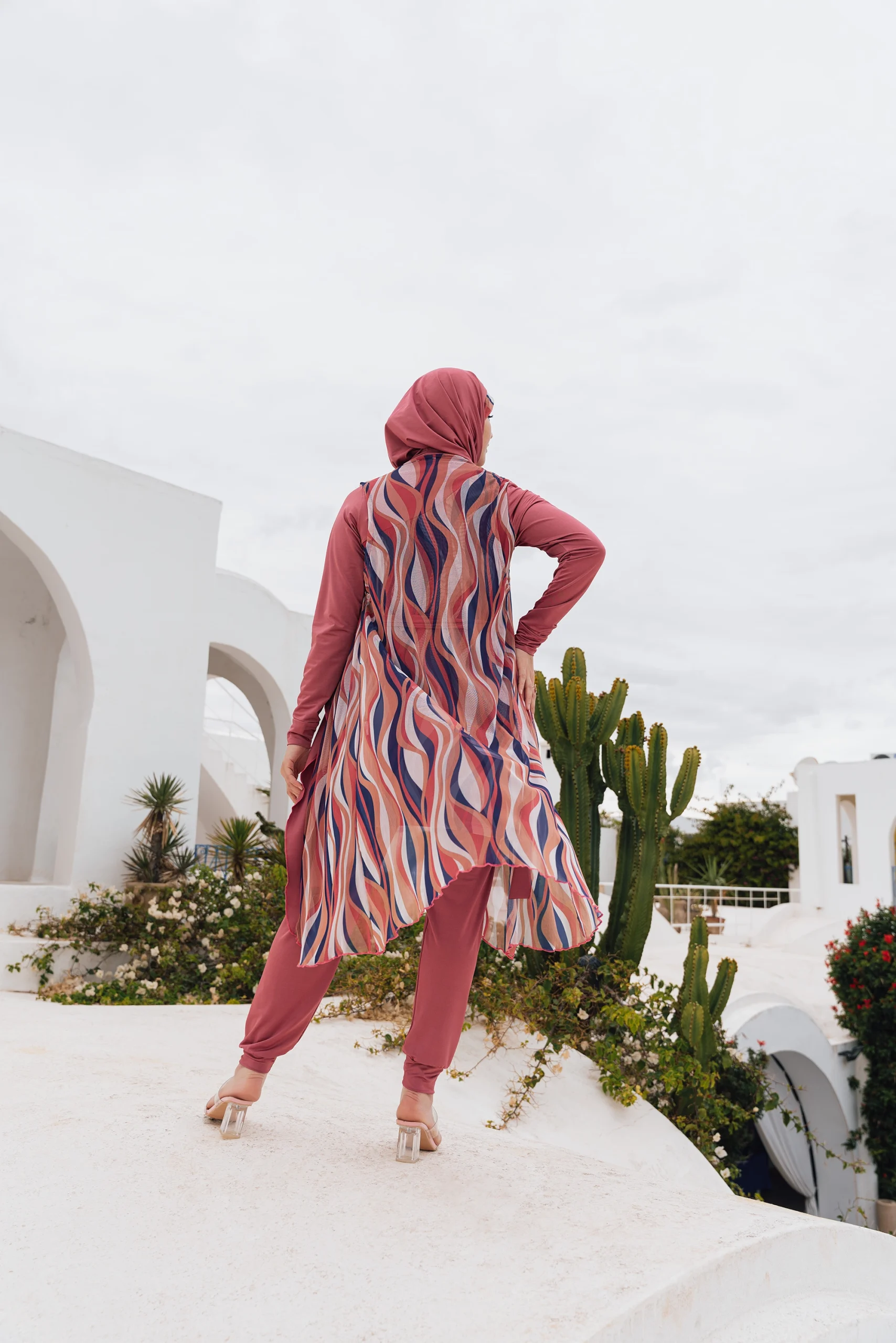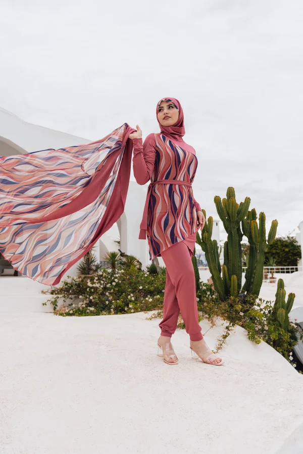 Vous cherchez un maillot de bain élégant et couvrant qui correspond à votre style ? Ne cherchez plus ! Le Maillot de Bain Femme Voilée – Rana est la réponse à vos besoins. Conçu pour les femmes voilées, ce magnifique maillot de bain rose sémon imprimé avec mirage aubergine, blanc et rose est à la fois tendance et pratique. Avec ses ceintures ajustables à la taille, vous pouvez être sûre de trouver le confort et l’ajustement parfait pour vos sorties à la plage ou à la piscine.