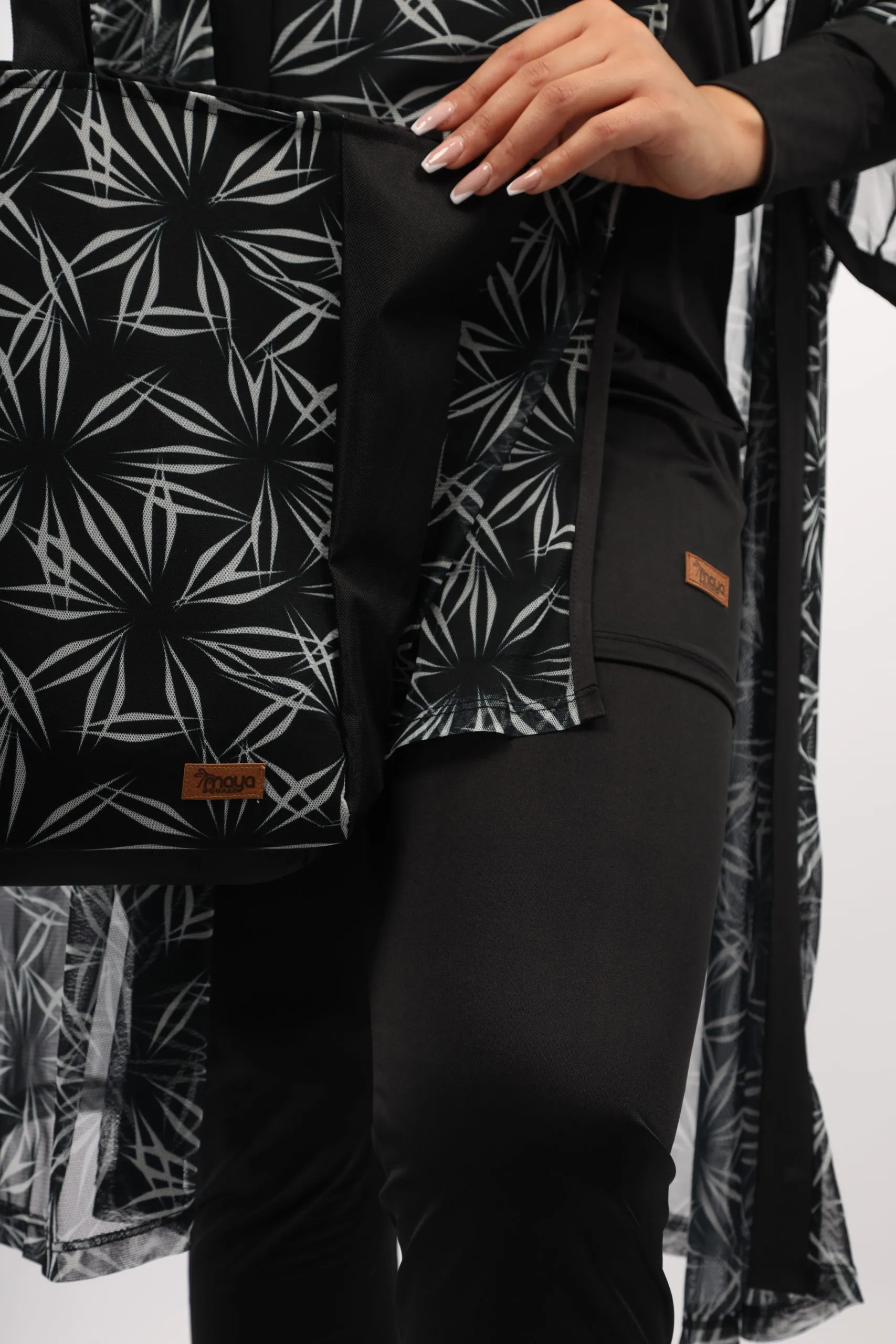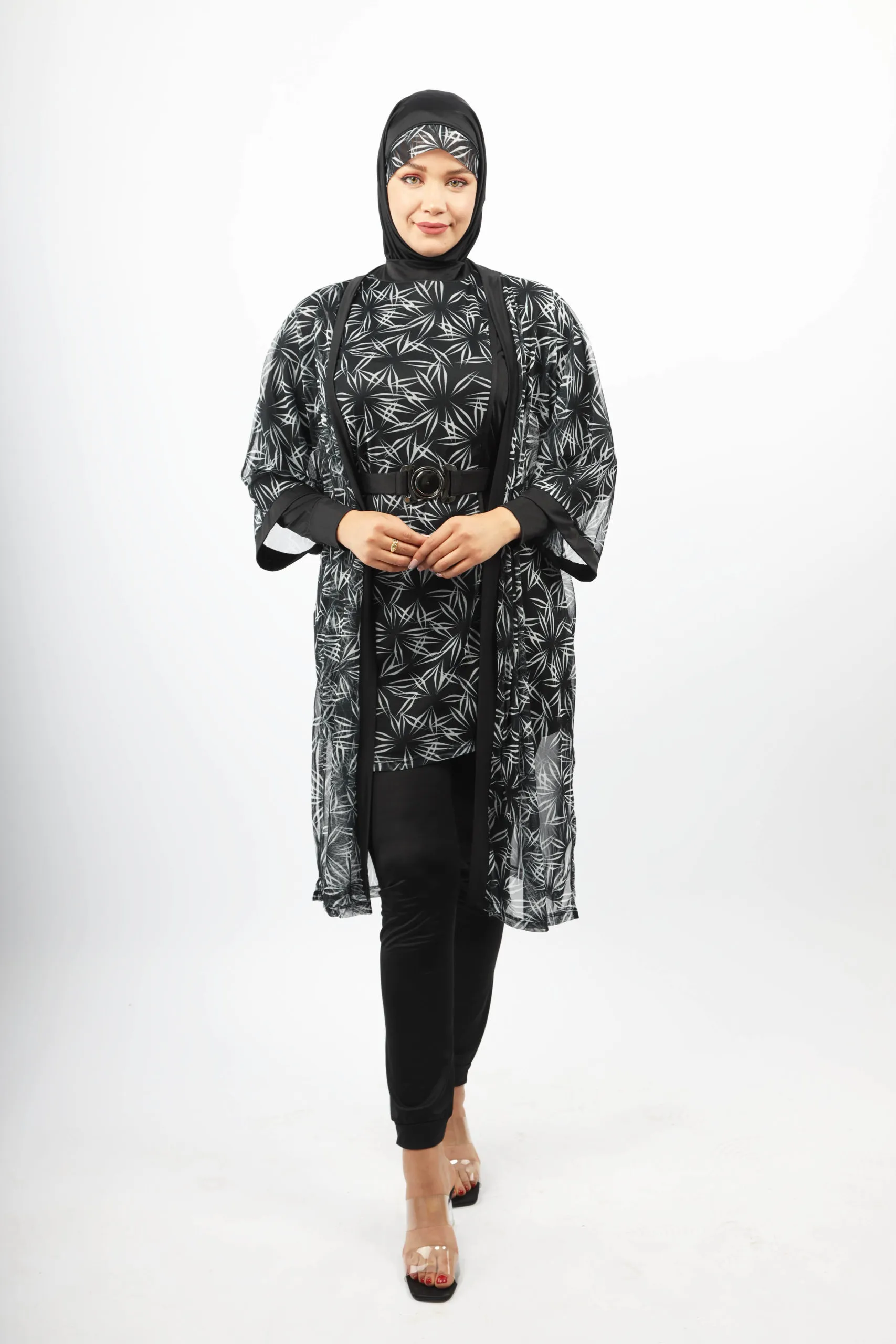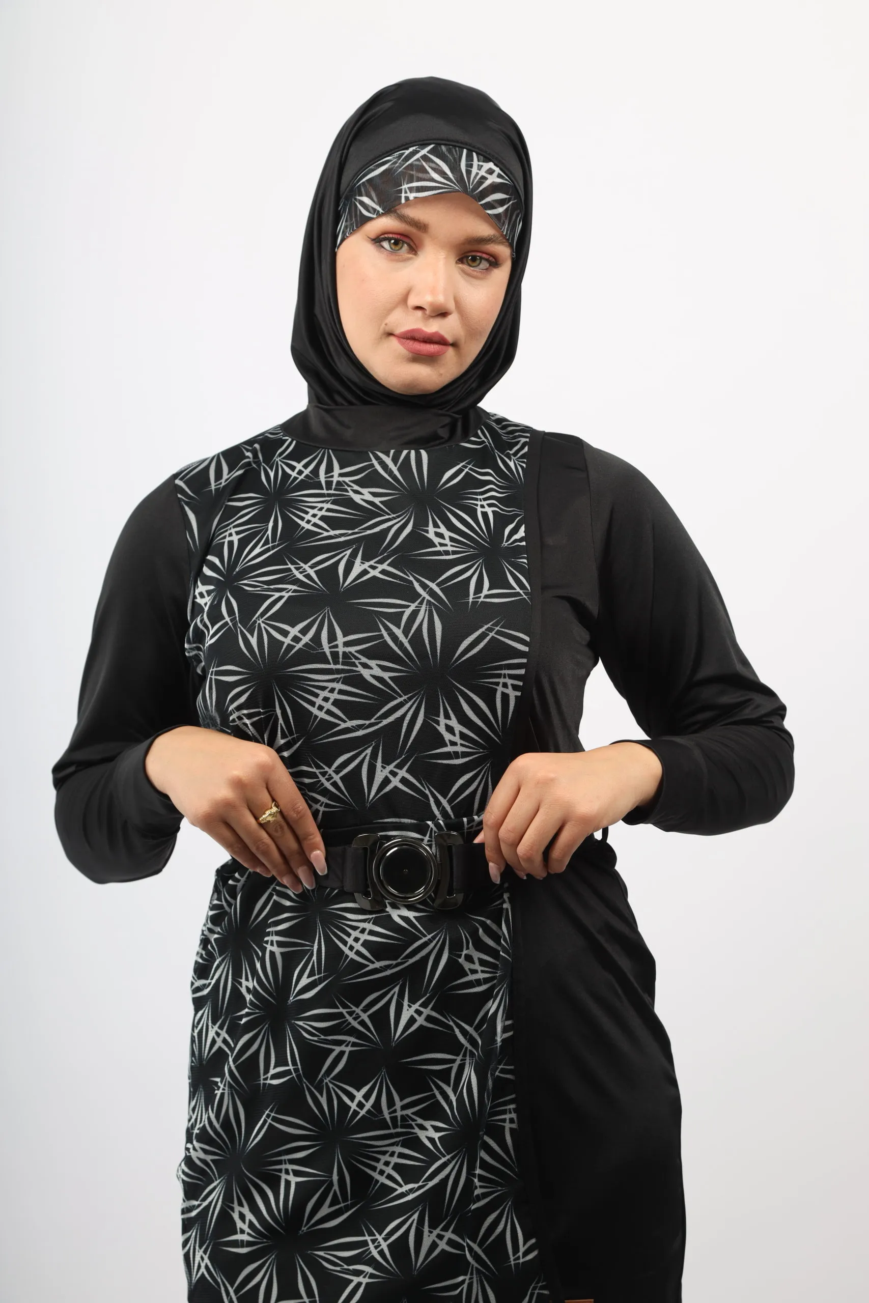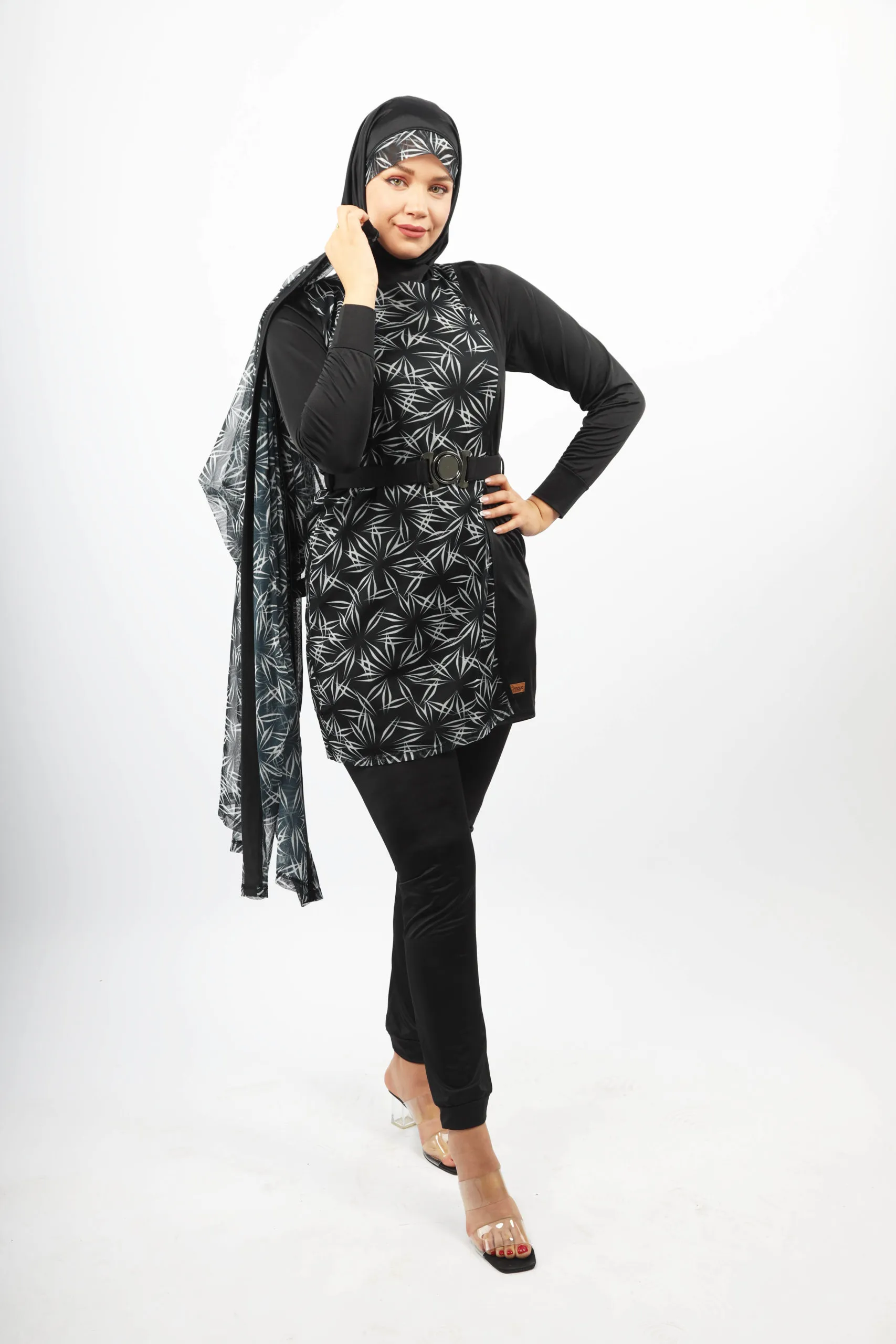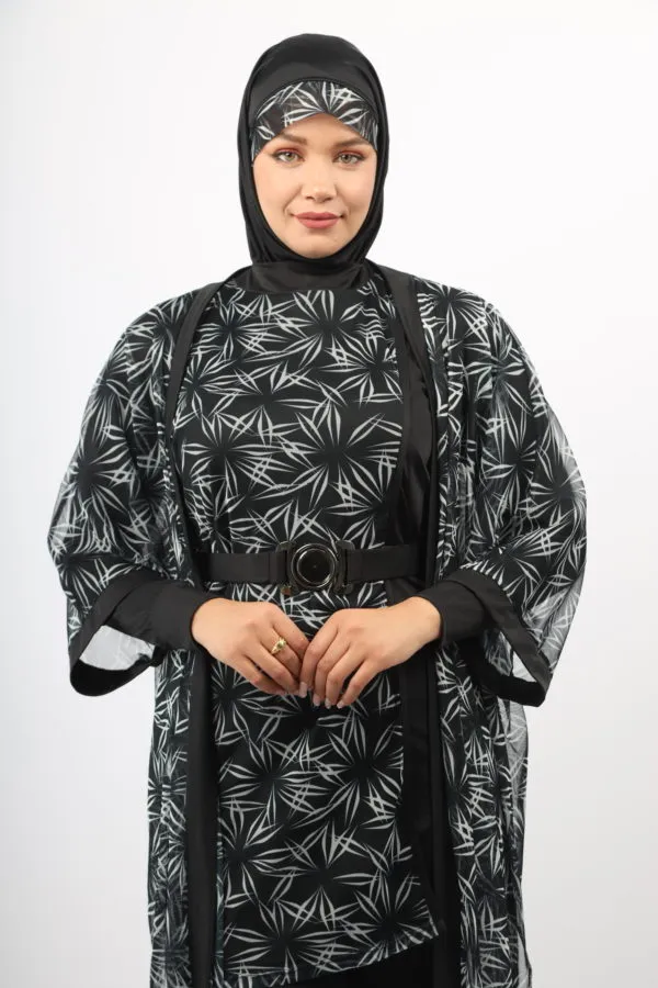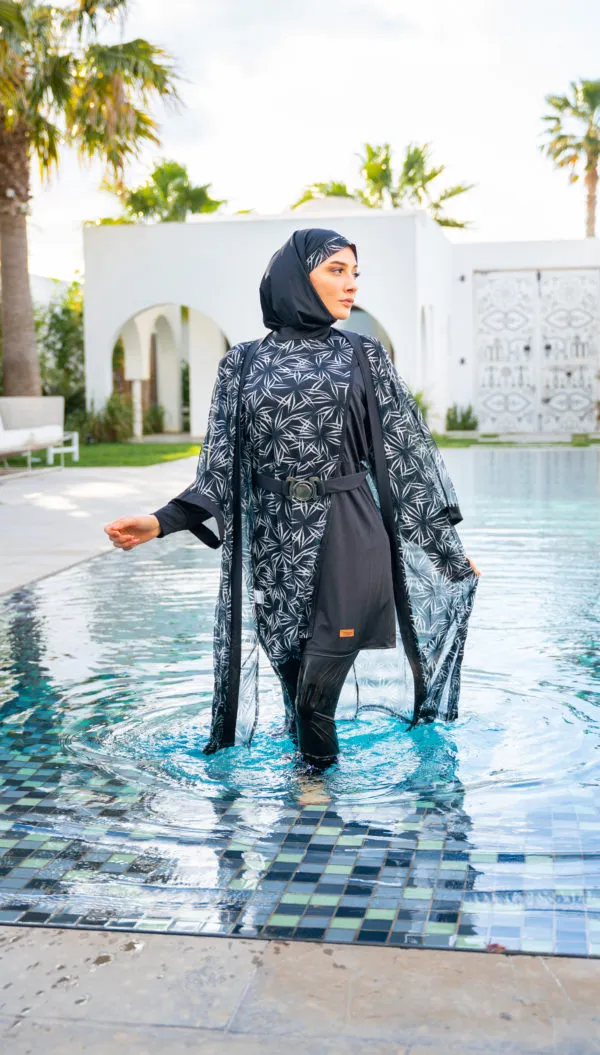 Notre modèle IRIS se compose de quatre pièces pensées pour votre confort et votre liberté de mouvement. La tunique noire, doublée d’une tulle haute gamme à l’impression noir et blanc, associe style et praticité. Le pantalon coupe droite, avec élastique à la taille et bourses aux chevilles, offre une coupe moderne et ajustée. Le foulard ajustable vous procure un confort optimal dans l’eau, et le cache maillot assorti complète l’ensemble avec style. Les boutons à la taille permettent de fixer le pantalon à la tunique grâce à un élastique, assurant une tenue parfaite.