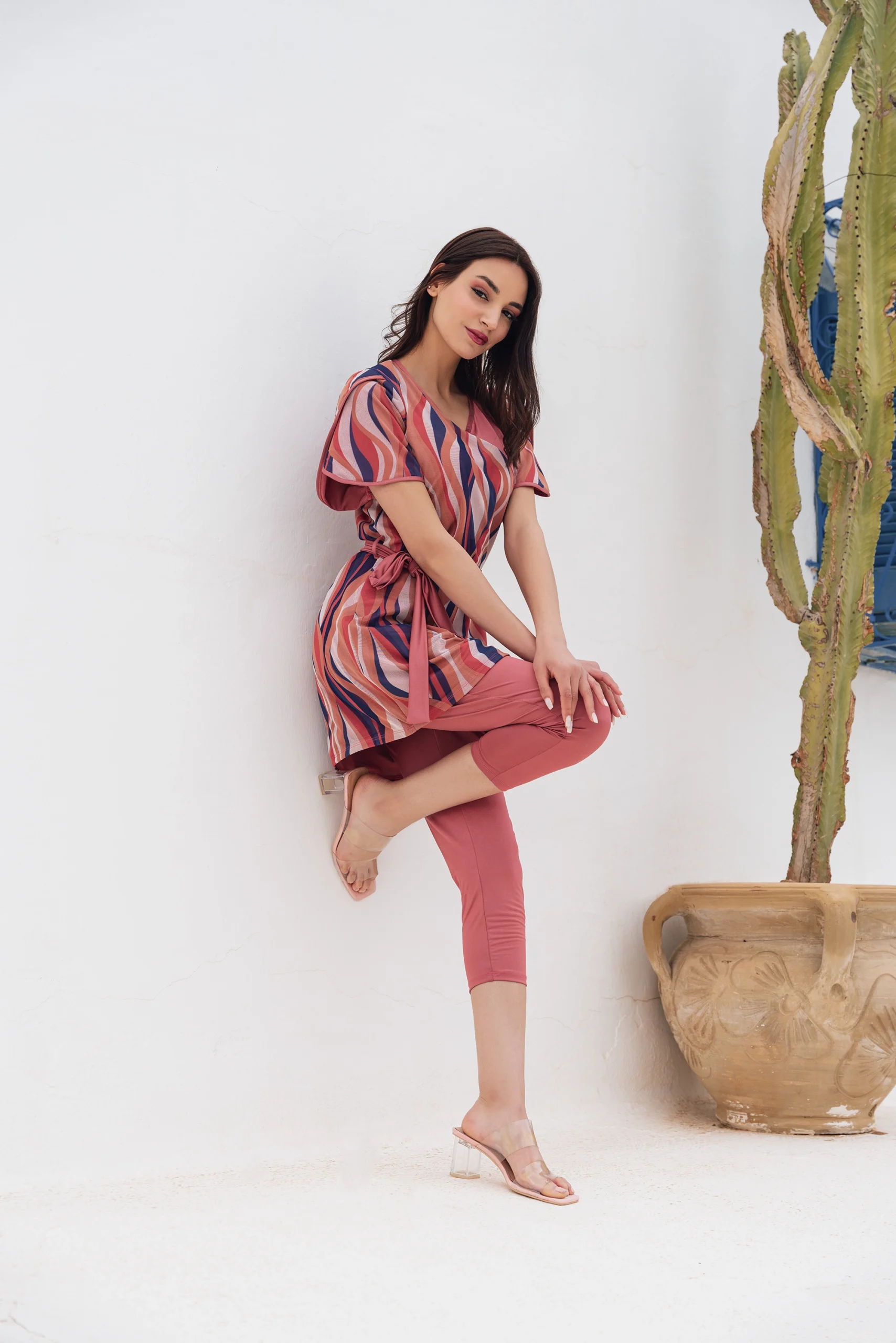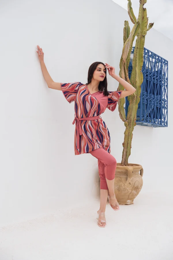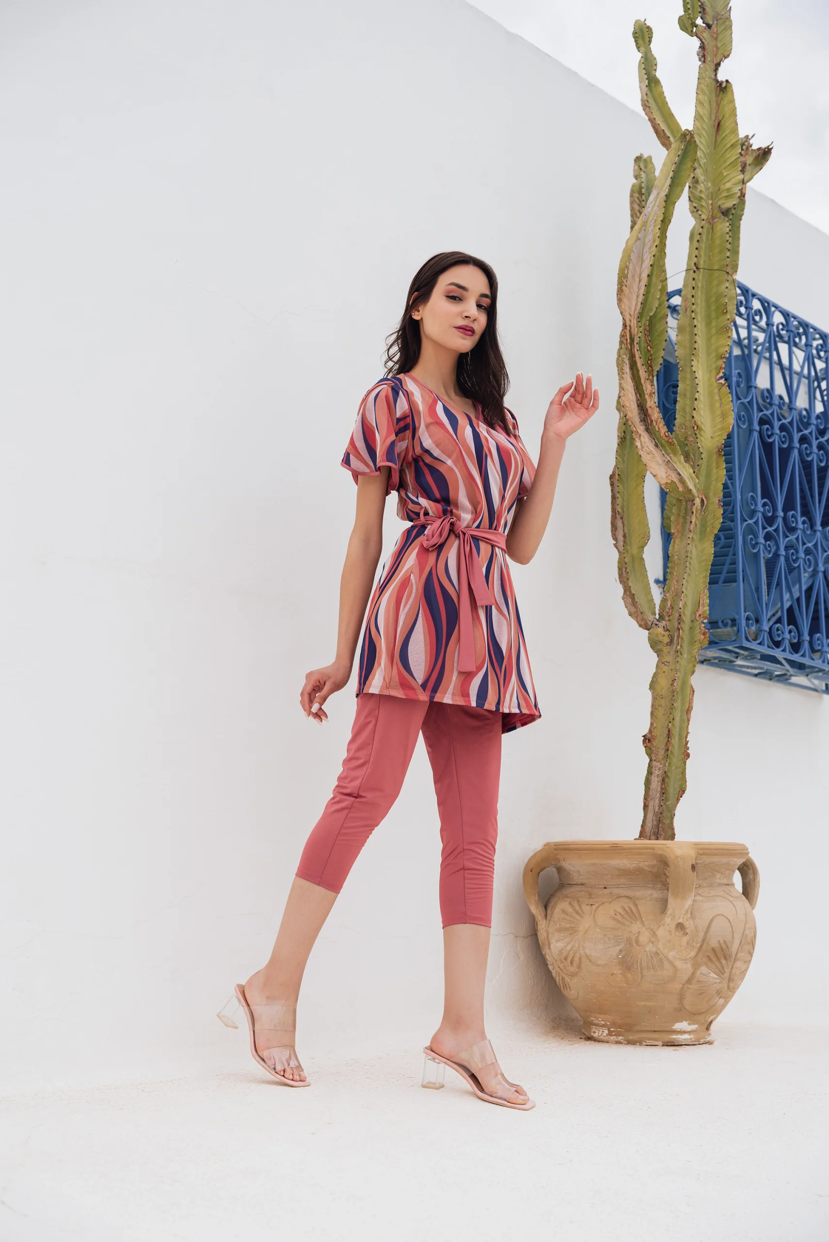Plongez dans le luxe avec notre Tankini Maillot de Bain Femme – Rana, une véritable pièce maîtresse de votre garde-robe estivale. Conçu pour la femme moderne et dynamique, ce tankini rose imprimé avec mirage aubergine, blanc et rose vous assure un look à la fois chic et tendance. Les ceintures à la taille ajoutent une touche de glamour, tandis que la tunique col V avec impression en tulle et le legging court vous offrent un confort absolu et une liberté de mouvement incomparable.